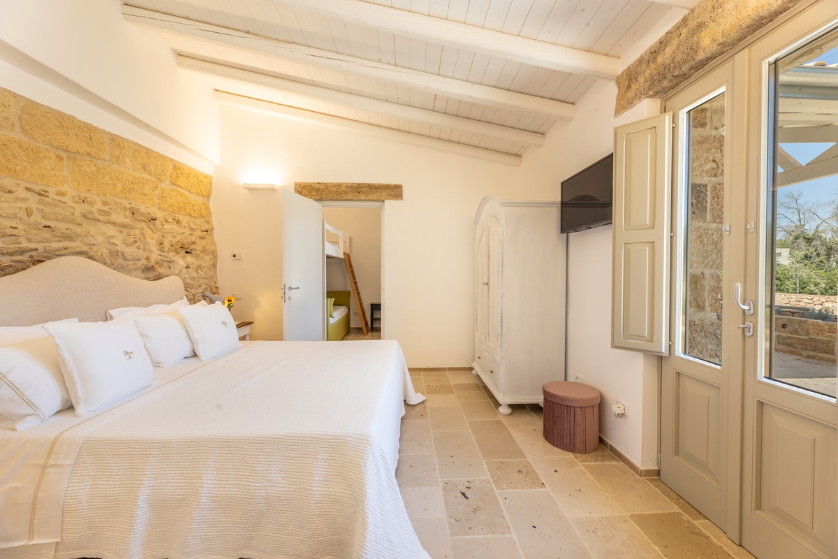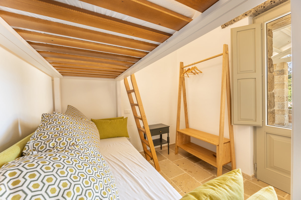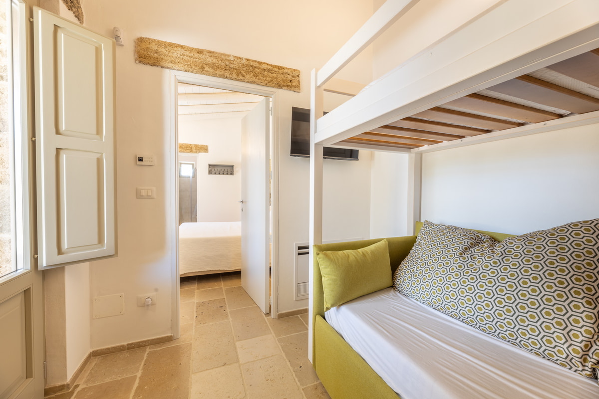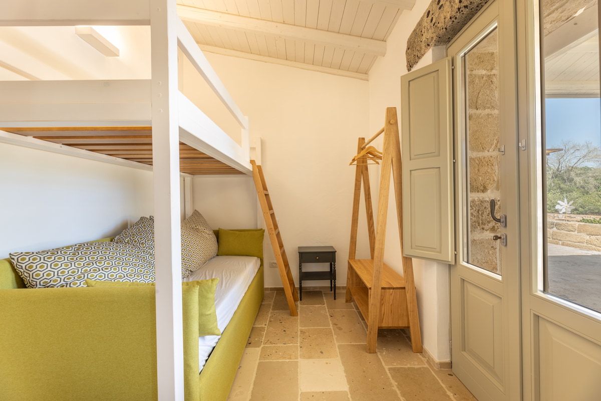 Dedicata ad Angela, moglie del titolare, questa camera è una dichiarazione d’amore trasformata in spazio da vivere. I suoi 24 mq racchiudono un rifugio intimo, luminoso e accogliente, arredato in stile modern country con dettagli che richiamano la tradizione salentina. Perfetta per famiglie grazie al letto a castello, unisce funzionalità e calore autentico. L’ingresso indipendente assicura riservatezza, mentre la porta comunicante la rende ideale per chi desidera restare vicino ai propri cari. È un luogo dove ogni gesto si intreccia con l’autenticità della vita rurale.